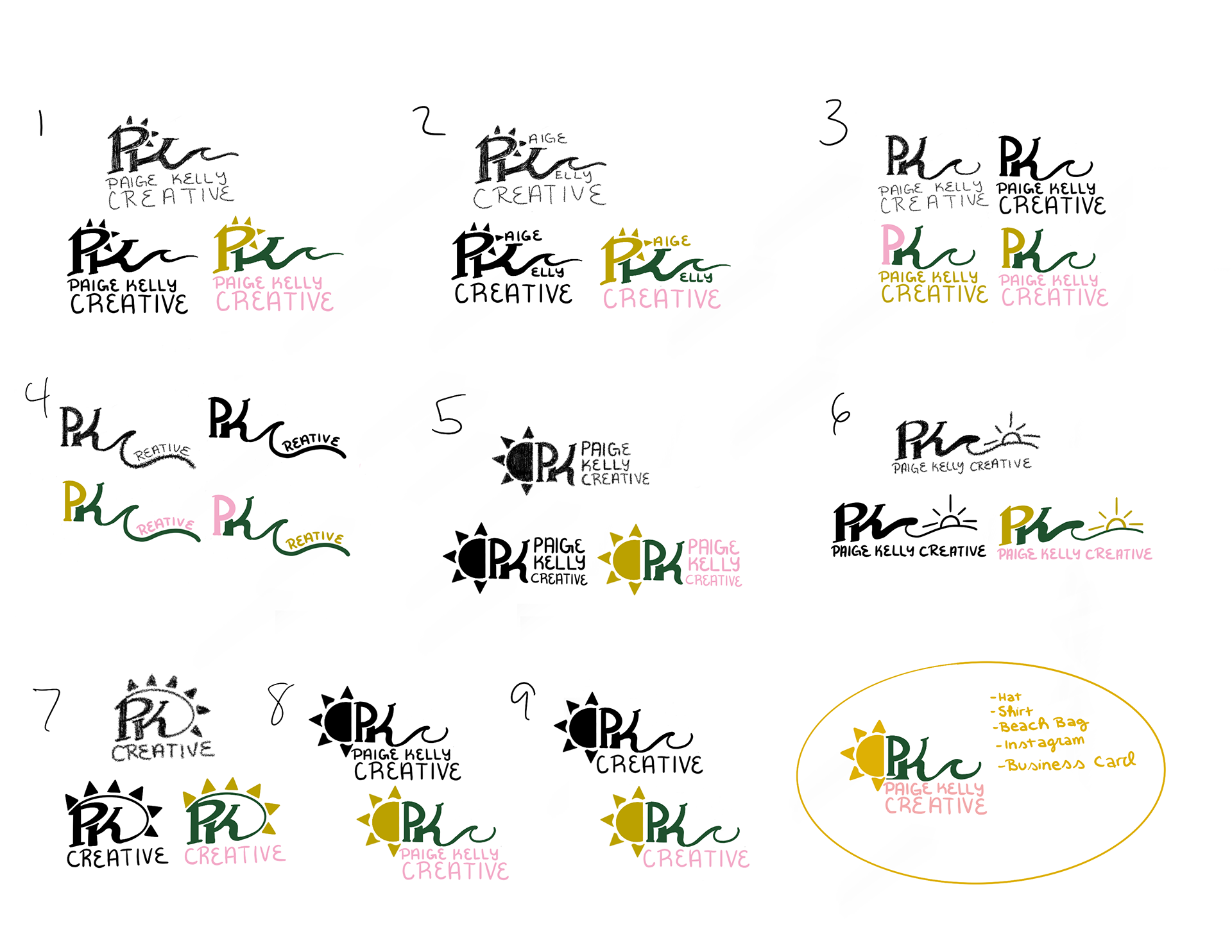 Paige Kelly Creative is a brand I designed for a classmate. She grew up by the beach, and the beach is a large part of her brand. She wanted something that showcased that. For the brand, I created a logo that features a wave and a sun, and I chose colors that feature the colors of the beach at sunset, with a golden yellow sunset pink, and emerald green sea. The pattern was created from the sun rays within the logo.